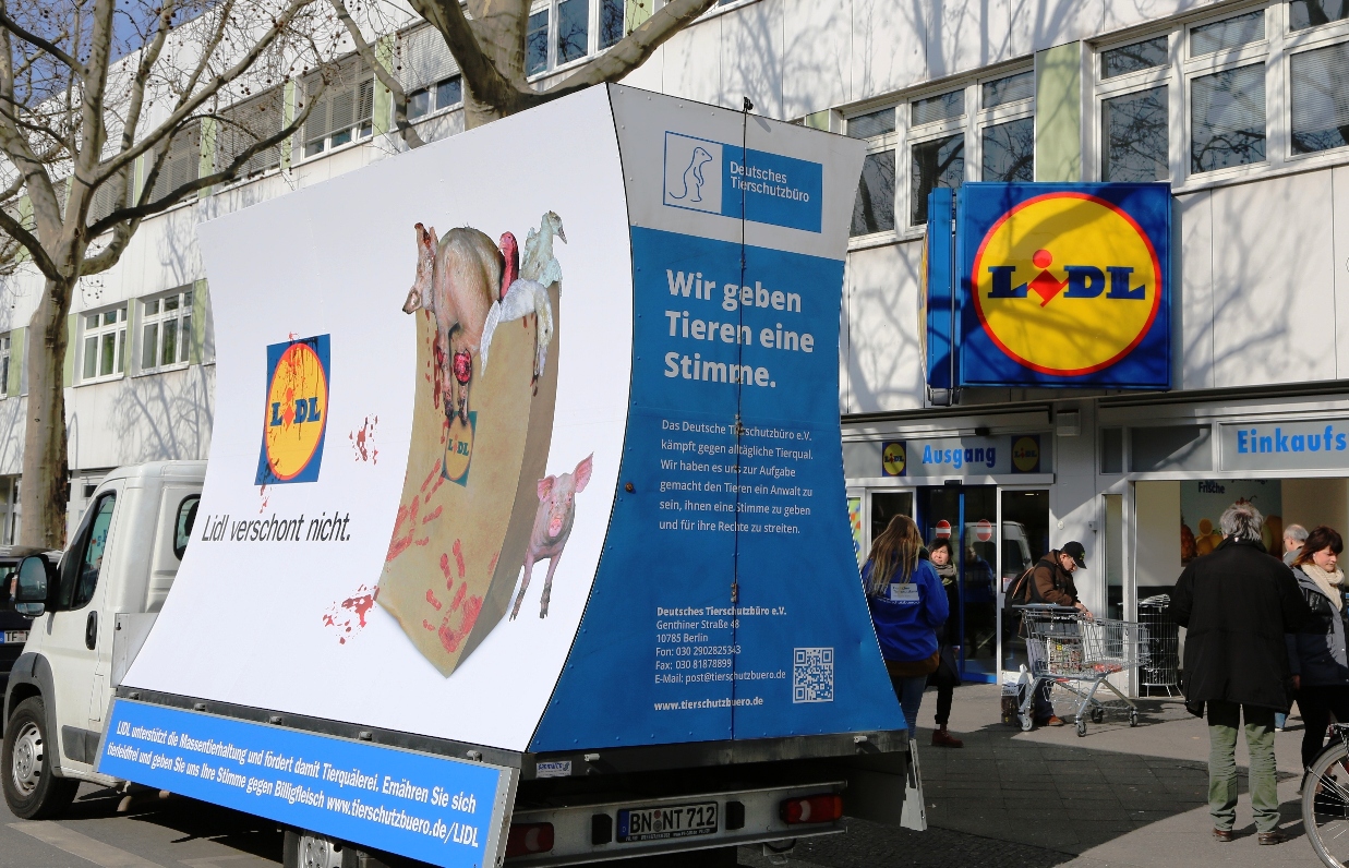 Weitere Informationen, ein Hintergrundvideo und eine Übersicht, wann der Plakat-Wagen in welcher Stadt ist, finden Sie hier: www.tierschutzbuero.de/lidl