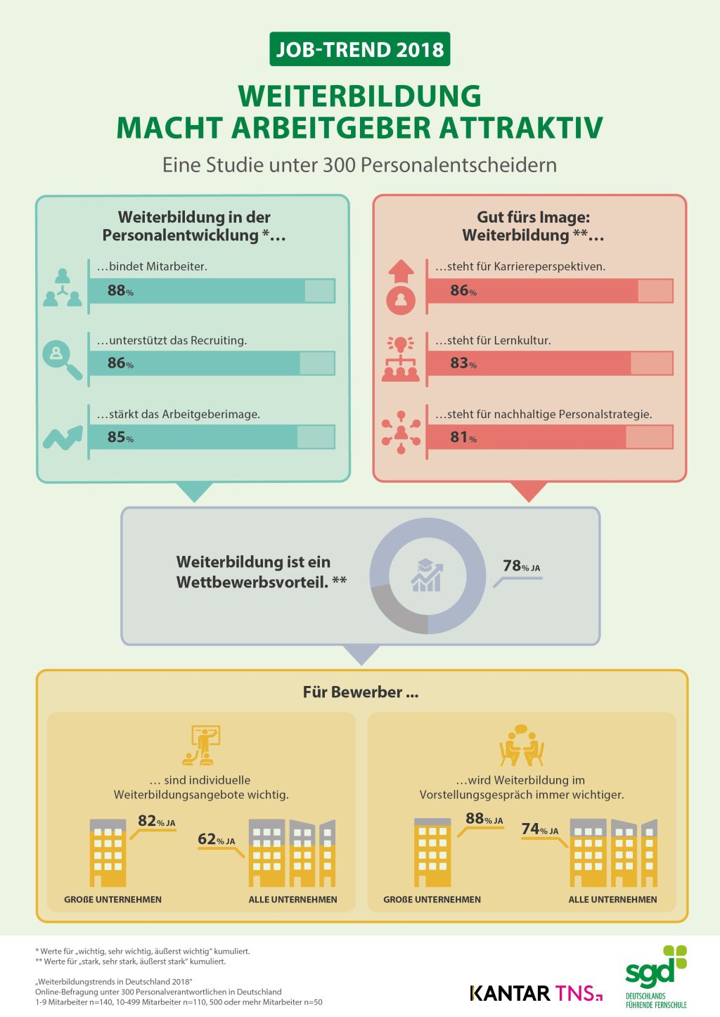 (IINews) - Pfungstadt bei Darmstadt, 06.06.2018 - Arbeitgeber brauchen ein überzeugendes Image und schlagkräftige Argumente, um Talente für sich zu gewinnen und an sich zu binden. Wer sein eigenes Unternehmen zukunftssicher aufstellen und auf dem Arbeitsmarkt attraktiv positionieren will, spricht Bewerber mit gezielten Angeboten zur Förderung an - gefragt sind vor allem individuelle und flexible Weiterbildungsmöglichkeiten. Das zeigen die aktuellen Ergebnisse der Studie "Weiterbildungstrends in Deutschland 2018". Die jährliche Umfrage unter 300 Personalverantwortlichen führte Kantar TNS im Auftrag der sgd bereits zum zehnten Mal in Folge durch.
