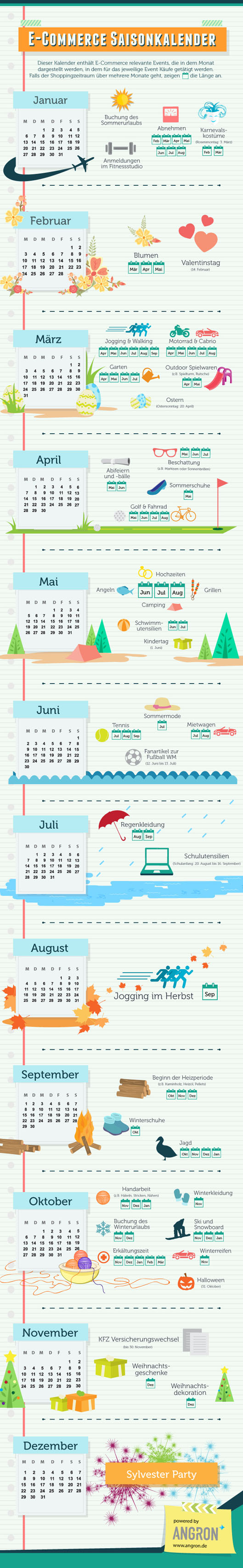 Wer den Geburtstag der Ehefrau vergisst, zieht ihren Ärger auf sich. Ähnliches gilt auch im Berufsleben: Wer eine E-Commerce-Kampagne zu spät initiiert, läuft Gefahr, potenzielle Kunden nicht zu erreichen und diese an die Konkurrenz zu verlieren. Um dies zu vermeiden, gibt es ab sofort unter http://www.angron.de/e-commerce-saisonkalender/ den ANGRON E-Commerce Saisonkalender, der eine zielgerichtete Kampagnenplanung vereinfacht. Neben klassischen jährlichen Fixpunkten wie den Valentinstag oder Weihnachten erinnert der Planer genauso an relevante, branchenspezifische Termine wie beispielsweise den Reifen- oder Versicherungswechsel.