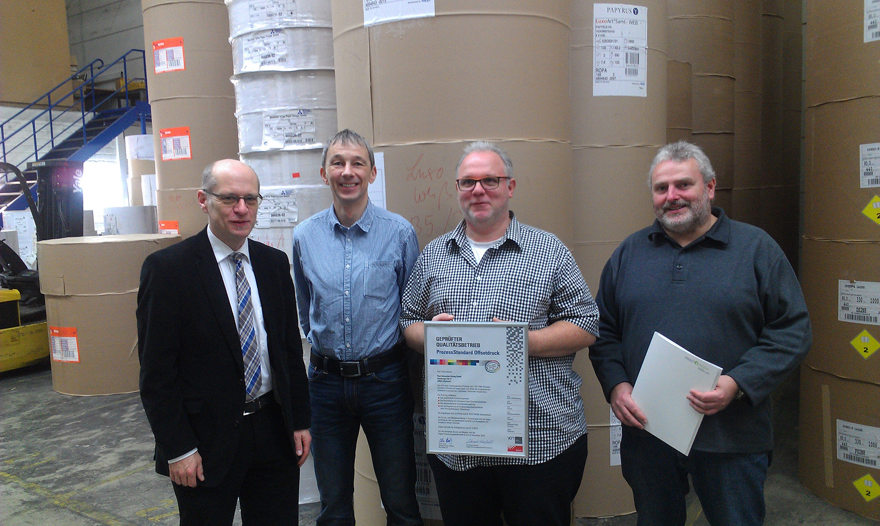 (IINews) - Die Druckerei Paul Albrechts Verlag hat nach den strengen Vorgaben des Prozess-Standard Offsetdruck (PSO) den Bereich Endlosrollendruck erfolgreich rezertifiziert. Der Verband Druck + Medien Nord-West überreichte am 14. Januar 2014 die neue Urkunde. Damit ist das Familienunternehmen aus Lütjensee einer der wenigen Rollenendlosbetriebe aus Norddeutschland, welche die PSO-Prüfung erfolgreich absolviert haben. Der PSO stellt ein zentrales Instrument zur Prozesskontrolle und Qualitätssicherung in der Druckindustrie dar.