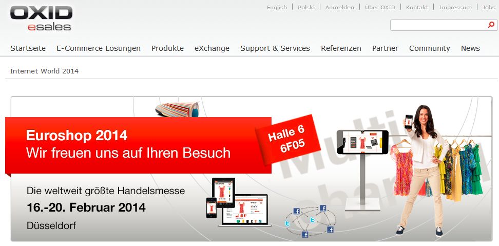 Der Messestand der OXID eSales AG befindet sich in Halle 06 / Stand 6F05. Besucher können vorab unter http://www.oxid-esales.com/euroshop2014 einen persönlichen Gesprächstermin mit den OXID Experten vereinbaren.