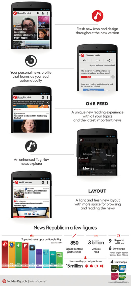 (IINews) - Berlin, den 16. Januar 2014 - Mobiles Republic, führender Anbieter von Nachrichten-Apps, veröffentlicht heute eine neue und verbesserte Version der preisgekrönten App News Republic®. News Republic 4.0 ist ab sofort für Nutzer von iPhone®, iPhone touch®, Android? Tablets und Smartphones verfügbar. Diese neue Version beinhaltet erhebliche Verbesserungen der semantischen TagNav?-Technologie, mit der die App während der Nutzung die Lesegewohnheiten der Leser erlernt. Dadurch werden Artikelempfehlungen möglich die zu einer personalisierten Leseerfahrung führen.