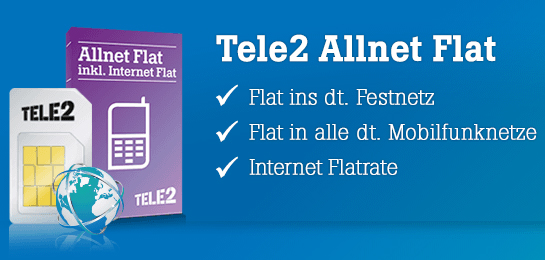 (2) Tele2 Allnet Flat + Internet mit Allnet Flatrate in alle deutschen Netze, 500 MB Datenvolumen und 9 Cent pro SMS für monatlich 14,95 Euro im ersten Jahr und anschließend 19,95 Euro monatlich
