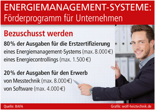 Ausgaben, die nach diesem BAFA-Programm förderfähig sind, können innerhalb eines Zeitraums von drei Jahren mit bis zu 20.000 Euro pro Unternehmen bezuschusst werden. Für die Erstzertifizierung eines Energiemanagement-Systems nach DIN EN ISO 50001 werden 80 Prozent der Kosten bewilligt, maximal 8.000 Euro. Die Vorgabe dieser weltweit gültigen Norm soll helfen, dass Deutschland durch die Erschließung ungenutzter Energieeffizienz-Potenziale seine ehrgeizigen Klimaschutzziele erreicht. Wird ein Energiecontrolling zertifiziert, gibt es bis zu 1.500 Euro. Förderfähig mit 20 Prozent der Ausgaben bzw. maximal 8.000 Euro ist zudem die Anschaffung von Mess-, Zähler- und Sensoriktechnologie, die die relevanten Daten für das Energiemanagement liefert. Auch die für solch ein System erforderliche Software, die die Anforderungen der DIN EN ISO 50001 erfüllt, wird mit bis zu 4.000 Euro bezuschusst. Über detaillierte Förderkonditionen kann man sich im Internet unter www.bafa.de informieren.