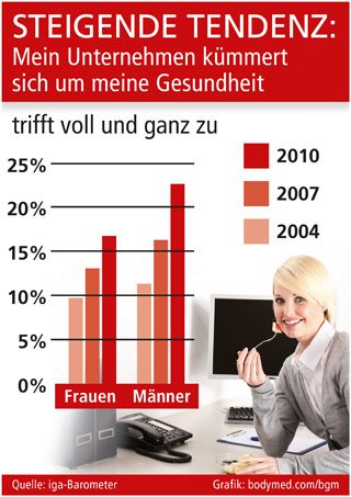 (IINews) - sup.- Betriebliches Gesundheitsmanagement ist in immer mehr Firmen ein wichtiger Bestandteil der Unternehmenssteuerung. Denn das Bewusstsein dafür, welchen wesentlichen Einfluss gesunde und motivierte Mitarbeiter auf den Unternehmenserfolg haben, ist in den letzten Jahren deutlich gestiegen. Diese Tendenz bestätigt auch das letzte iga-Barometer von 2010, einer repräsentativen Befragung von ca. 2.000 Erwerbstätigen, durchgeführt von der Initiative Gesundheit und Arbeit (iga). Demnach bestätigen 22,8 Prozent der Arbeitnehmer und 16,4 Prozent der Arbeitnehmerinnen, dass die Aussage "Mein Unternehmen kümmert sich um meine Gesundheit" voll und ganz zutrifft. Bei den vergleichbaren Befragungen im Jahr 2004 und 2007 war dieser Prozentanteil noch wesentlich geringer ausgefallen (siehe Tabelle).