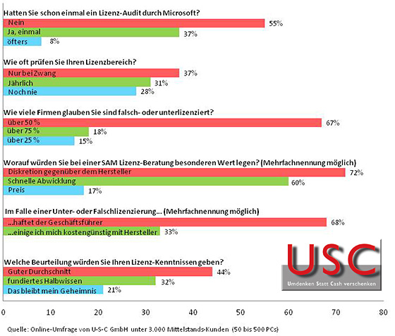 "Angesichts unserer Umfrage-Ergebnisse überrascht es nicht, dass Microsoft Lizenz-Audits (http://www.u-s-c.de/audit-unterstuetzung.html) , in 2013 zusätzliche Umsätze von circa 300 Millionen machen konnte!", ergänzt Walter Lang, "wir können an alle mittelständischen Betriebe nur dringend appellieren, ihren Software-Lizenz-Bereich in Ordnung zu bringen bevor sie in einer akuten Audit-Situation sind!"