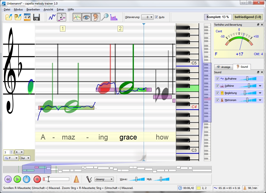 Mit capella melody trainer üben Musiker, Töne und Intervalle sauber zu treffen, oder sie laden ihre Literatur und spielen nach Noten. Als Quelle dient jede capella- oder MIDI-Datei.