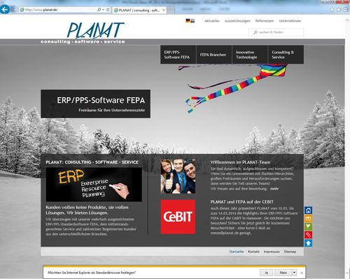(IINews) - Ostfildern, 30. Januar 2014 - Pünktlich vor der weltgrößten IT-Messe CeBIT hat der Softwarehersteller Planat (http://www.planat.de) seine Corporate Identity und den Internet-Auftritt komplett überarbeitet. Branchenspezifisch aufbereitete Informationen, zeitgemäße technische Basis sowie ein neues Design stellen die Eckpunkte des aktualisierten Internetauftritts dar: Auf der Homepage www.planat.de (http://www.planat.de) findet der Besucher schnell das Wichtigste über Planat und seine mehrfach ausgezeichnete ERP/PPS-Standardsoftware FEPA (http://www.planat.de/ERP_PPS_FEPA/__ERP-PPS-Software-FEPA.html) .