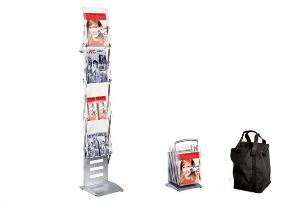 In den letzten Jahren haben sich faltbare Prospektständer von wackligen Gestellen zu soliden, ansehnlichen Begleitern auf Messen, Tagungen und Kongressen entwickelt. Durch den vermehrten Einsatz stabiler Klappmechanismen stehen diese Ständer ihren zerlegbaren Konkurrenten kaum noch nach. Ein schöner Nebeneffekt ist bei manchen faltbaren Modellen die Möglichkeit, den Ständer bereits im Büro mit Prospekten und Broschüren zu bestücken kann und vor Ort nur noch auseinander zu ziehen.