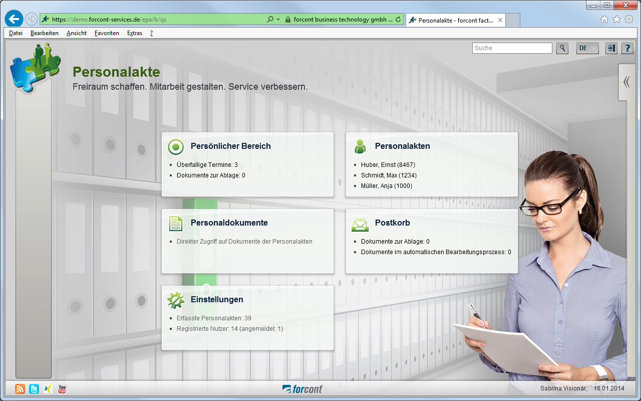 Als erfahrener Informations- und Dokumentenlogistiker übernimmt Rhenus alle Dienstleistungen im Bereich des Aktenhandlings - vom Transport über das Aufbereiten und Digitalisieren der Akten bis hin zu deren sicheren Entsorgung oder Archivierung. forcont bietet mit seiner elektronischen Personalakte (http://www.forcont.de/produkte/personalakte/erleben/) die passende, leistungsfähige Anwendung für das Management der digitalisierten Akten - wahlweise als On-premise- oder als SaaS-Lösung. Die gemeinsame erfolgreiche Projektarbeit garantiert Entscheidern in Personalabteilungen dabei eine nahtlose Integration der Leistungen und ein effizientes Projektmanagement. Näheres zu Kundenvorteilen und Projektvorgehen erfahren Interessierte in den Crashkursen zur Einführung einer elektronischen Personalakte: www.forcont.de/infocenter/veranstaltungen/crashkurs-personalakte.