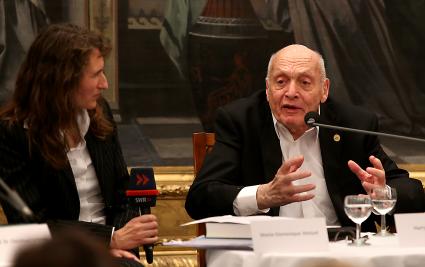 Harry L. Ettlinger im Gespräch mit SWR2-Moderatorin Marie-Dominique Wetzel am 15. Februar in der Kunsthalle Karlsruhe anlässlich der Verleihung der Staufermedaille in Gold des Landes Baden-Württemberg (FOTO)