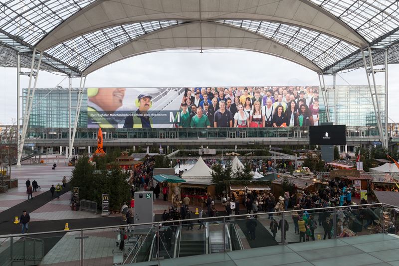 (IINews) - Das nennt man Mitarbeitermotivation! Statt eines kleinen, eingerahmten Fotos hinter der Eingangstür, setzte der Flughafen München sein Team auf der größten Werbefläche des Airports in Szene. Im Dezember 2013 prunkte einen ganzen Monat lang ein Dankeschön in Übergröße an der Westfassade. "Der Flughafen München bedankt sich bei allen Mitarbeitern" hieß es auf dem rund 3.000 m² großen Riesenposter, auf dem ein Ausschnitt des knapp 7.000 Mann starken Airport-Teams zu sehen war.