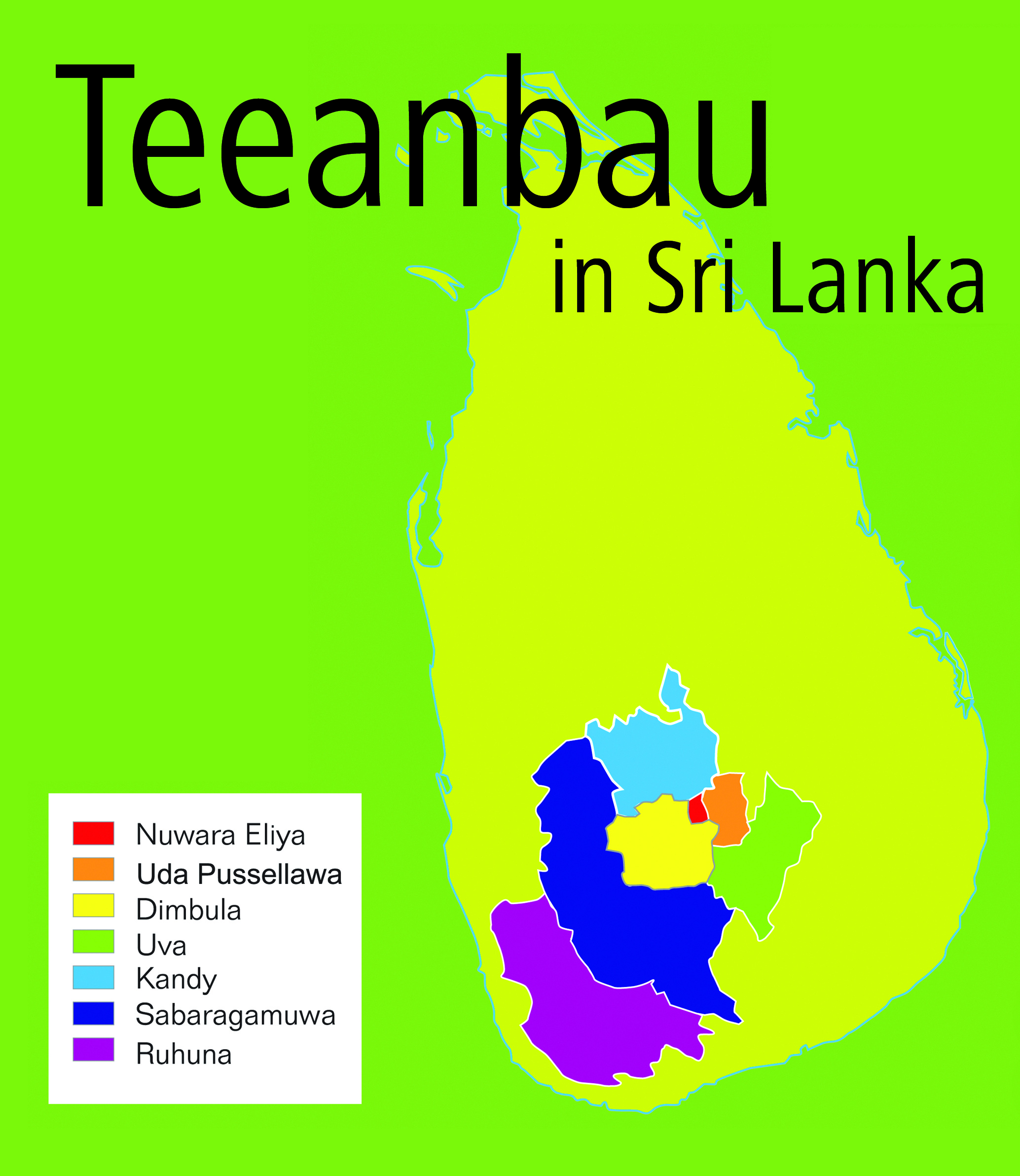 Die Teeanbaugebiete der tropisch-warmen Insel im Indischen Ozean erstrecken sich um den 2.243 Meter hohen Berg Sri Pada (früher Adam's Peak). Hier im südwestlichen Gebirgsmassiv sind die Teepflanzen starken jahreszeitlichen Wetterschwankungen ausgesetzt, so dass in den Regionen zeitlich unterschiedlich geerntet wird. Im Hochland über 1.200 Metern wachsen in den Gebieten Dimbula, Uva, Uda Pussellawa und Nuwara-Eliya Spitzentees. Die Höhe lässt die Blättchen vergleichsweise langsam wachsen, so dass sie einen außerordentlich weichen, aromenreichen Geschmack entwickeln. Ihr kupferroter bis goldroter Aufguss ist bei Teekennern heiß begehrt. Tiefer gelegen sind die Tee-Anbaugebiete Kandy (600 bis 1200 Meter) sowie Sabaragamuwa und Ruhuna (0 bis 800 Meter). Der Aufguss der hier wachsenden Tees ist kräftiger, besitzt einen vollen Körper und schimmert dunkel in der Tasse.