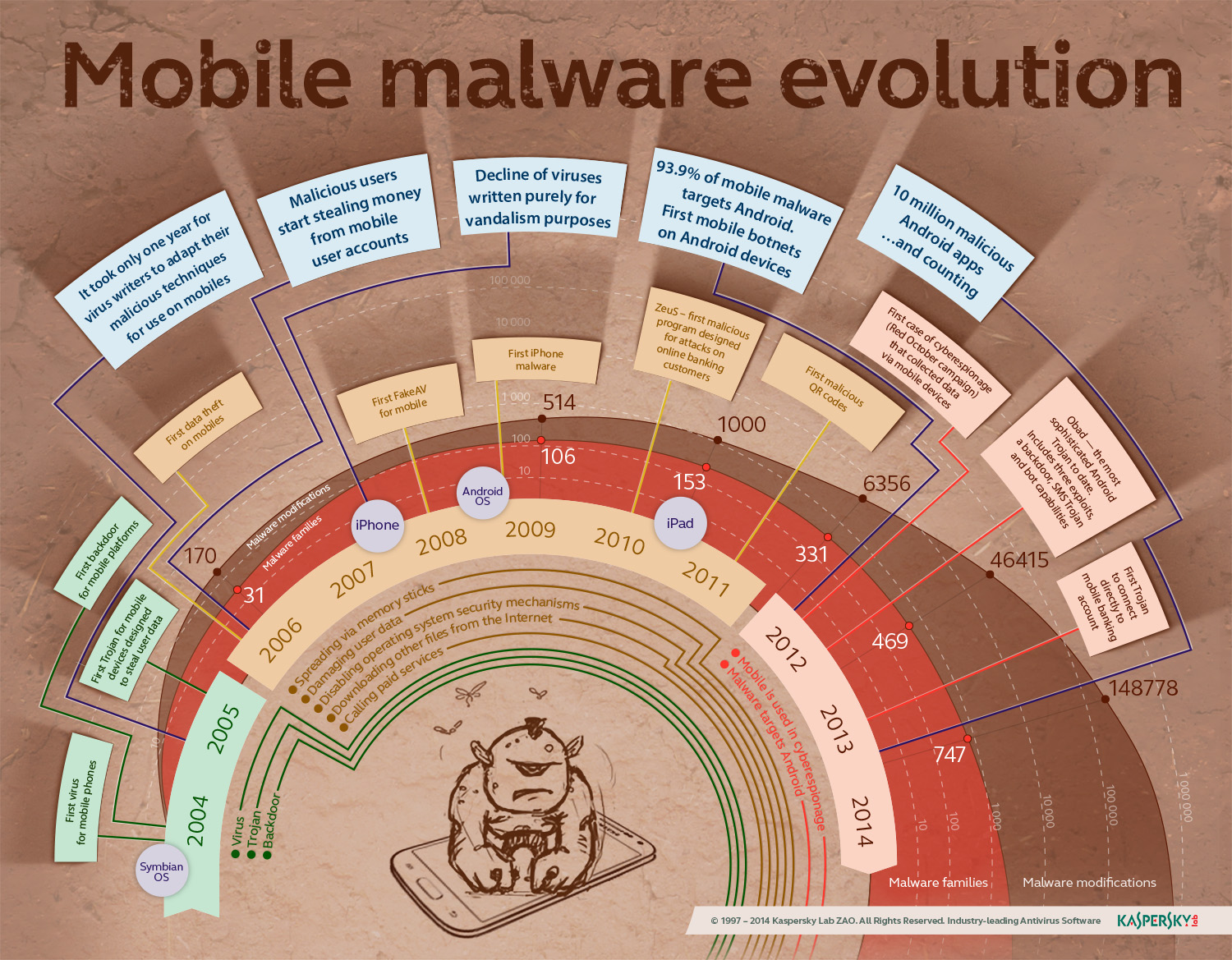 Kaspersky Lab entdeckte über 143.000 neue mobile Schädlinge im vergangenen Jahr 2013 - mehr als doppelt so viele wie im Jahr 2012. Insgesamt gibt es derzeit etwa 230.000 mobile Schadcodes. Mehr als ein Drittel (34 Prozent) davon kamen seit November 2013 hinzu.