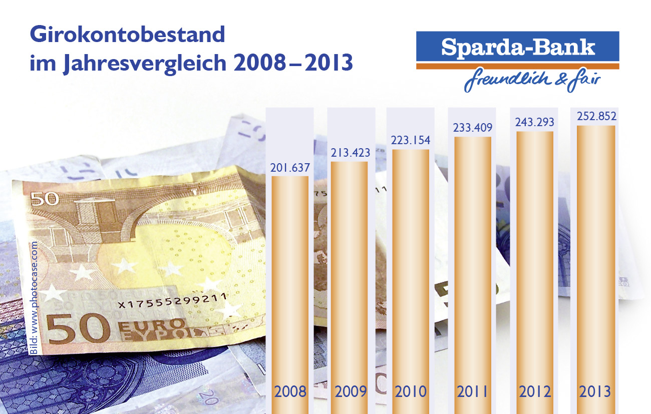 Das gebührenfreie Lohn-, Gehalts- und Rentenkonto ist unverändert attraktiv. 16.690 neue Girokonten wurden 2013 eröffnet. Zum Jahresende lag die Gesamtzahl bei 252.852 (+3,9 Prozent). Analog dazu entwickelte sich auch die Mitgliederzahl. Sie stieg um 3,4 Prozentpunkte auf 257.519. Dies entspricht einem Bruttozuwachs von 13.877.
