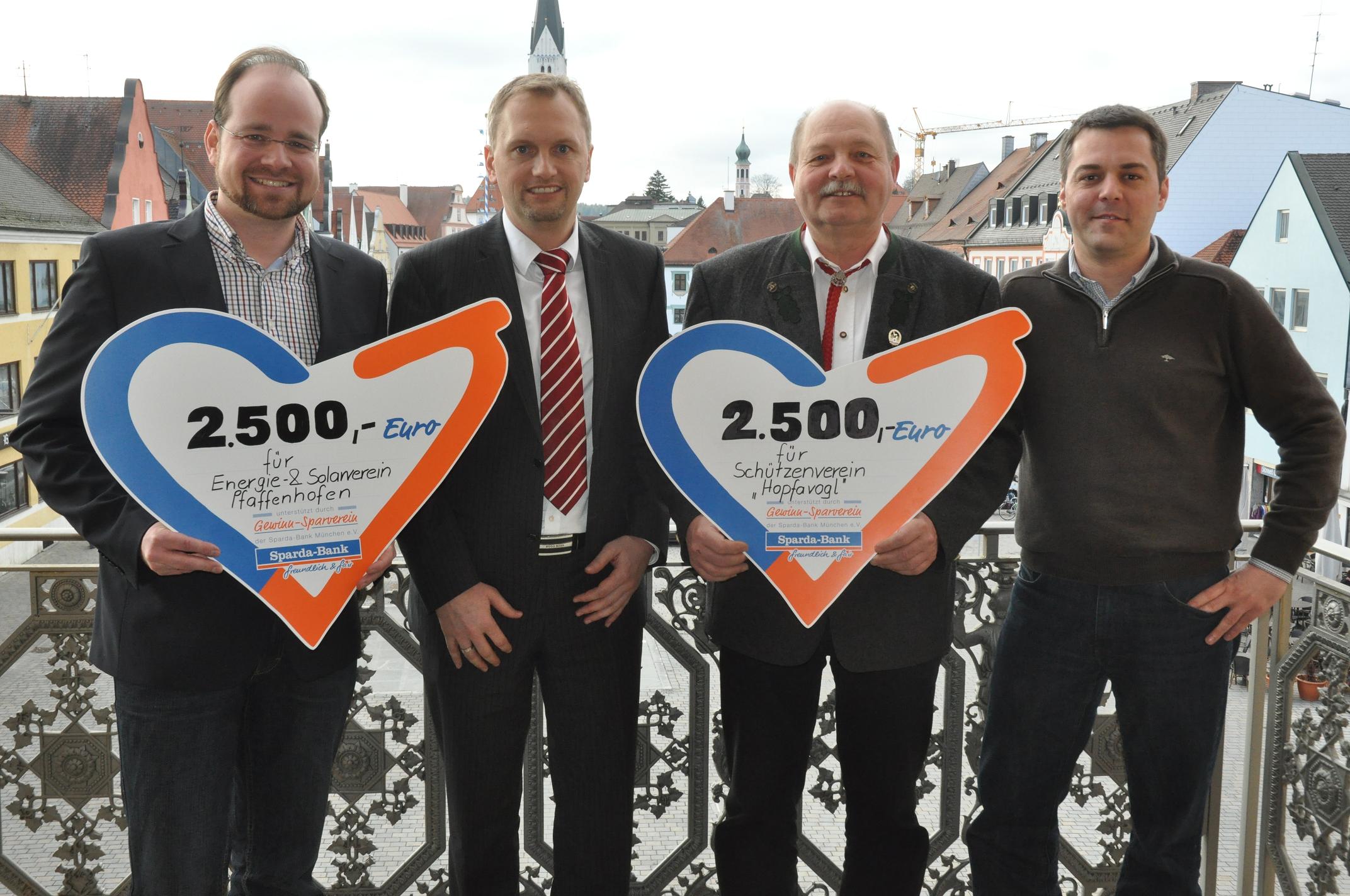 Sparda-Bank München gratuliert Pfaffenhofen zum Deutschen Nachhaltigkeitspreis - Spenden in Höhe von je 2.500 Euro für den Energie- und Solarverein Pfaffenhofen und den Schützenverein "Hopfavogl"