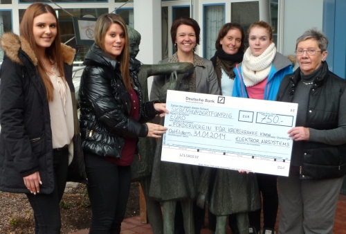 Frau Hoffmann, die stellvertretende Vorsitzende des Fördervereins für krebskranke Kinder e.V. empfing am Vormittag des 31. Januar 2014 eine kleine Elektror-Delegation, bestehend aus drei Auszubildenden, Personalleitung und Personalreferentin zur Scheckübergabe in der Kinderklinik Tübingen.