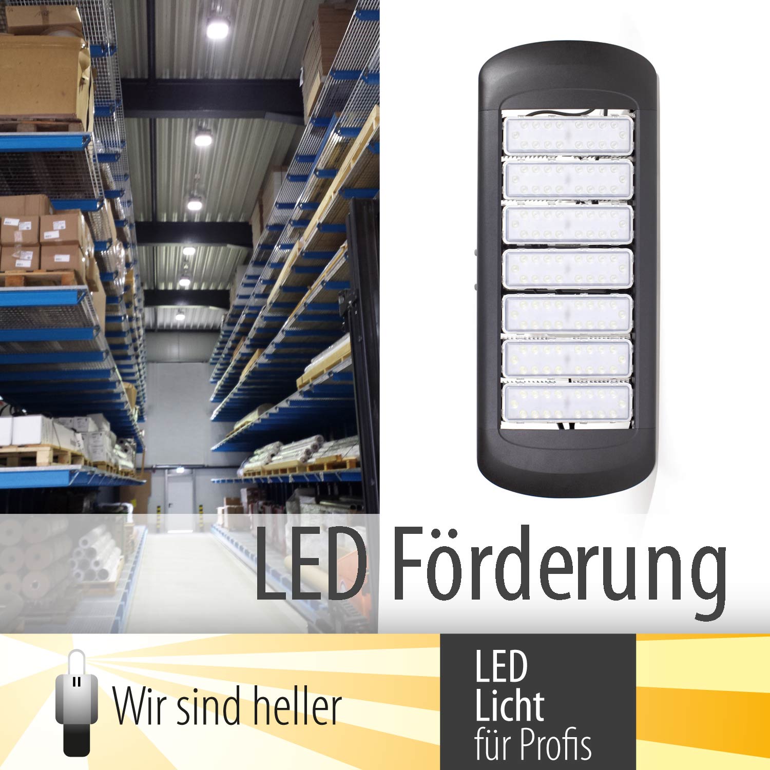 Kompetente Anbieter hocheffizienter LED Hallenstrahler wie "Wir sind heller" helfen den Kunden bei der Beantragung der Förderung. Eine Beratung, gefolgt von einer Lichtplanung, ist hierbei nötig um das passende LED Hallenstrahler System einzugrenzen und weitere Einsparpotenziale z.B. durch eine Lichtsteuerung auf zu tun.
