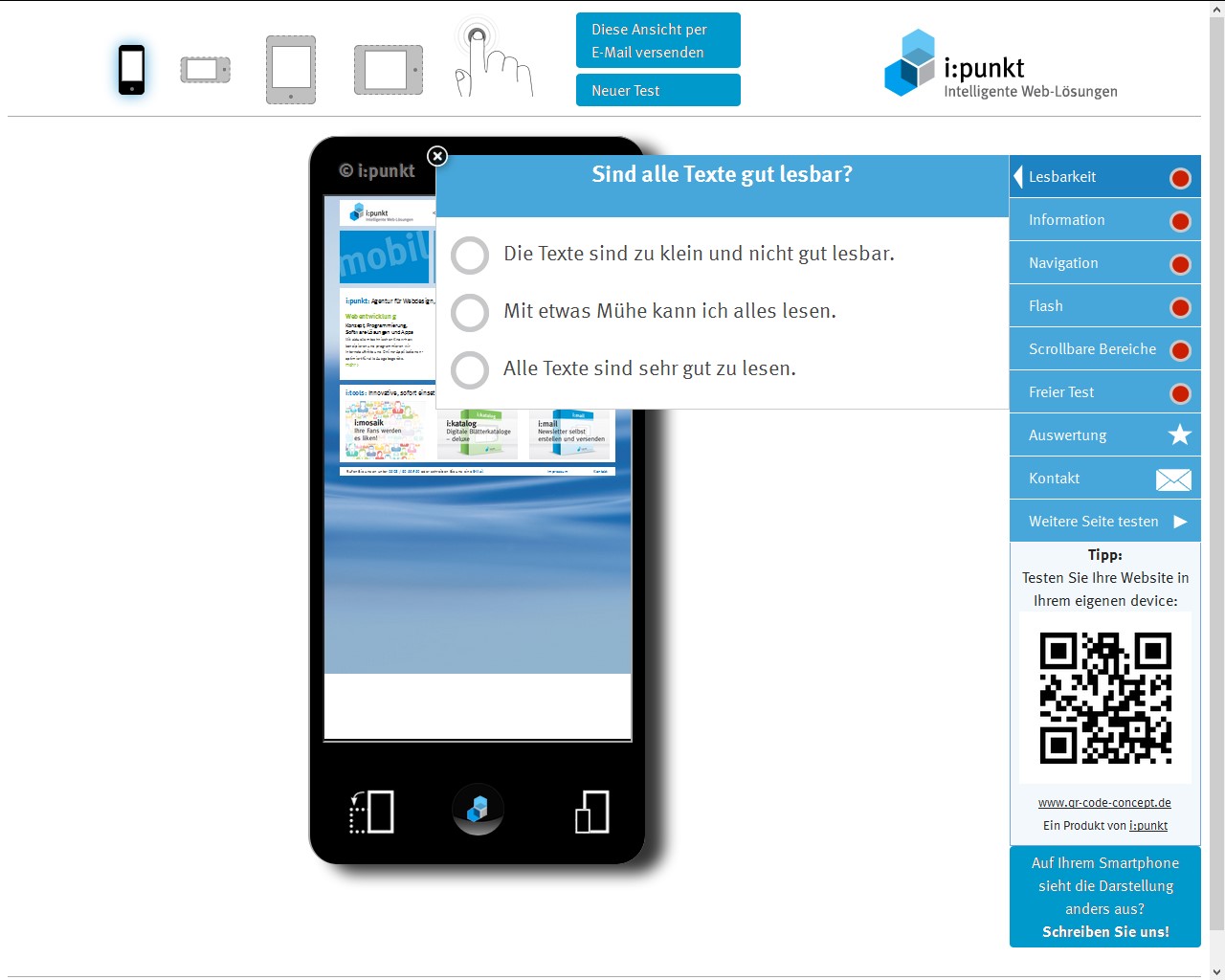 Anhand von sechs Fragen können Nutzer des Mobile-Check in nur drei Minuten prüfen, ob etwa die wichtigsten Informationen einer Website auf diversen mobilen Endgeräten auf einen Blick deutlich zu erkennen und alle Funktionen verfügbar sind. "Mobile Surfer sind noch ungeduldiger und werden die Website spätestens nach drei Sekunden verlassen, wenn die gesuchten Informationen nicht schnell zu finden sind", fasst Jörg Schmitz, Geschäftsführer von i:punkt und Initiator des Mobile-Check, zusammen.