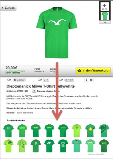 Den Grund für den gewinnbringenden Einsatz der picalike-Technologie erklärt Kielmann so: "Unsere Analysen zum Einkaufsverhalten im Internet zeigen, dass häufig Kleidung mit unterschiedlichen Texturen, aber gleichen Schnittmustern oder unterschiedlichen Schnitten bei ähnlichen Texturen bestellt wird. In herkömmlichen Shopsystem wird dieses Phänomen allerdings nicht berücksichtig: die Shops haben keine Möglichkeit, zum richtigen Zeitpunkt einzugreifen und Alternativen nach dem genannten Prinzip zu präsentieren. In der Folge verlässt der Kunde den Shop frustriert. In solchen Fällen eröffnen wir mit der visuellen Produktempfehlung (http://www.picalike.com/produkte/recommendor-1.php) Alternativen und kanalisieren so das Kaufinteresse auf andere, für den Kunden relevante, Produkte. Der Kunde findet, was er sucht und das Marketing bleibt effizient."