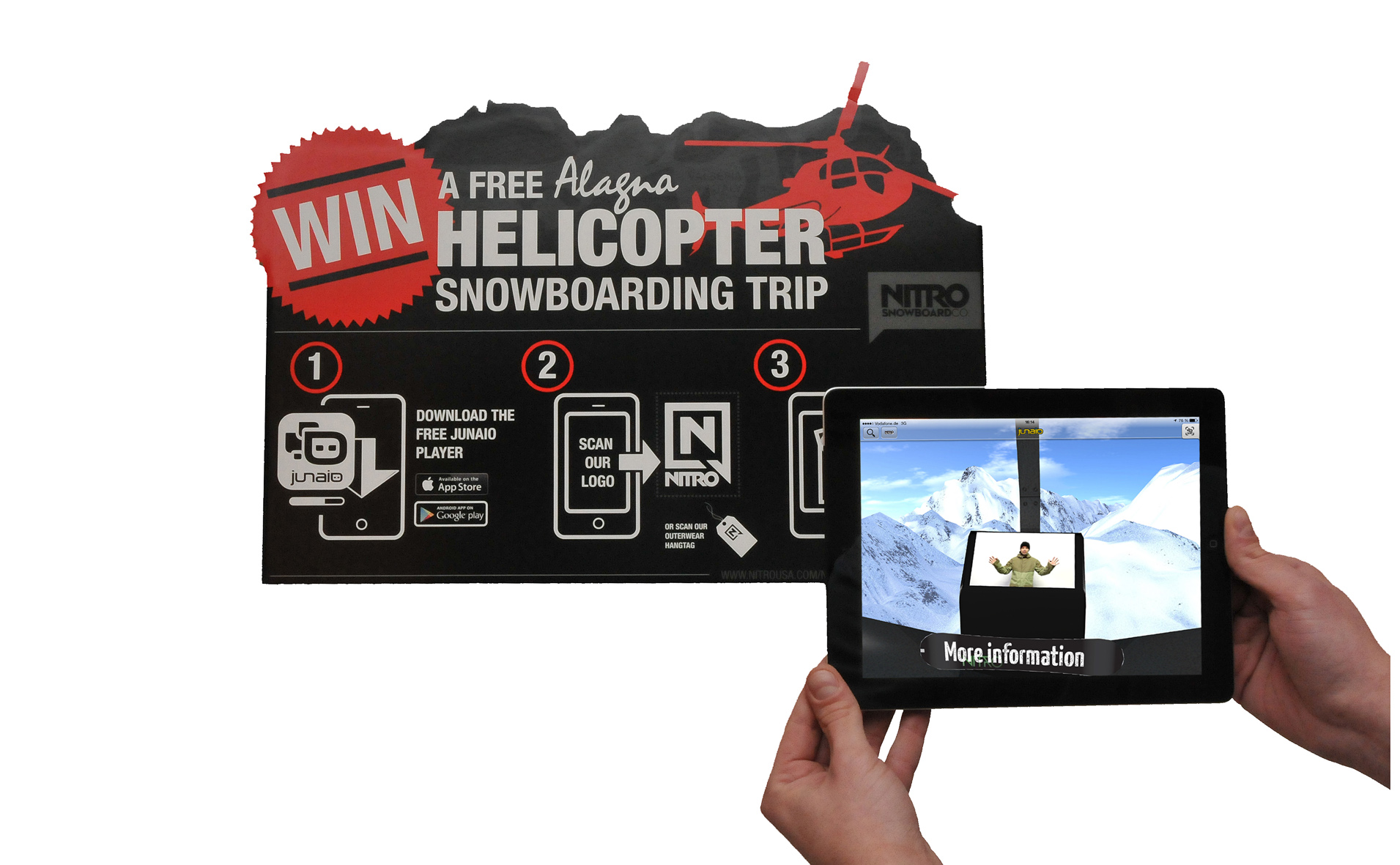 Ein scheinbar "normales" Logo entpuppt sich dabei als Schlüssel zu einem Markenerlebnis der besonderen Art. Wer das Nitro-"N" auf dem Display von DS Smith Packaging mit dem Smartphone abscannt, wird direkt in einen Helikopterflug über die schneebedeckten Gipfel der Alpen versetzt. Mit dieser P.O.S.-Aktion promotet Snowboard-Ausstatter Nitro ein Gewinnspiel. Erster Preis: ein Snowboarding-Trip mit Helikopter. Wen der virtuelle Flug "heiß" gemacht hat, der kann in der Augmented-Reality-Anwendung schließlich erfahren, wie er am Gewinnspiel teilnehmen und im echten Helikopter landen kann.