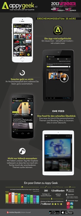 Appy Geek 4.0 ist kostenlos verfügbar für Android Smartphones und Tablets auf Google Play? (https://play.google.com/store/apps/details?id=com.mobilesrepublic.appygeek) , sowie für iPhone® und iPad® im App Store? (https://itunes.apple.com/de/app/appy-geek-nachrichten-zu-technologie/id438922464?mt=8) .