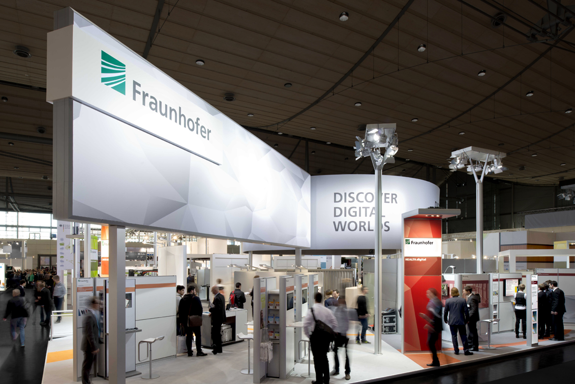 Die 546 Quadratmeter große Standfläche hat Expotechnik besonders einladend gestaltet: Sie war zu allen Seiten hin offen, so dass die Besucher die sechs Themenareale - Big Data, Smart City, Health, Security, Production und Career - direkt ansteuern konnten. Für eine klare Abgrenzung waren die verschiedenen Bereiche entsprechend der Fraunhofer-Farbpalette mit horizontalen Stellwänden, so genannten Klammern, und radialen Farbstreifen am Boden gekennzeichnet. Große, über dem Stand angebrachte Fraunhofer-Logos sorgten für eine weithin sichtbare Marken- und Fernkennung. Auf großflächigen Bannern über dem Stand und auf den Klammern zeigte sich das neu entwickelte Grafik-Pattern, das dem Stand durch stark abstrahierte Strukturen einen Zukunfts-Look verlieh.