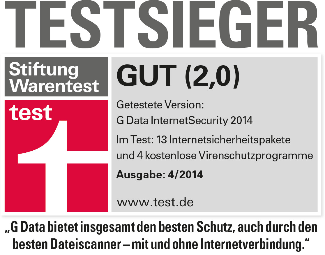 Testergebnisse beweisen: IT-Security Made in Germany schützt Internetnutzer am besten. Seit 2005 testet die Stiftung Warentest InternetSecurity Produkte. In allen sechs Tests, die von 2005 bis 2013 durchgeführt wurden, erreichte G Data die beste Virenerkennung. In Vergleichstests von AV-TEST demonstriert G Data regelmäßig beste Ergebnisse bei der Erkennung von Computerschädlingen. Auch international wurde G Data InternetSecurity von unabhängigen Verbrauchermagazinen als bestes Internetsicherheitspaket ausgezeichnet u.a. in Australien, Belgien, Frankreich, Italien, den Niederlanden, Österreich, Spanien und den USA.