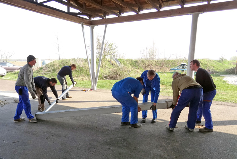Am Vormittag des 29. März trafen sich die Mitglieder des Heimatvereins und die Mitarbeiter von AkzoNobel, um mit den Geldern der überreichten Spende Gutes zu tun. Passend zu den von AkzoNobel erstellten Produkten standen viele Anstricharbeiten auf dem Plan. So wurden nicht nur die Stahlpfeiler der Überdachung am Dorfgmeinschaftshaus gestrichen, auch zwei Wände am Dorfgemeinschaftshaus erhielten eine leuchtend neue Farbe. Darüber hinaus wurde ein Geräteschuppen errichtet, in dem zukünftig vor allem Sitzbänke und Tische der Gemeinde sicher und trocken untergebracht werden können. Vor allem für die jüngeren Bewohner des Ortes ist es erwähnenswert, dass auch vorbereitende Arbeiten für das Aufstellen der Basketballkörbe erfolgten. Geplant ist, noch in diesem Jahr zwei Basketballkörbe am Dorfgemeinschaftshaus zu installieren.