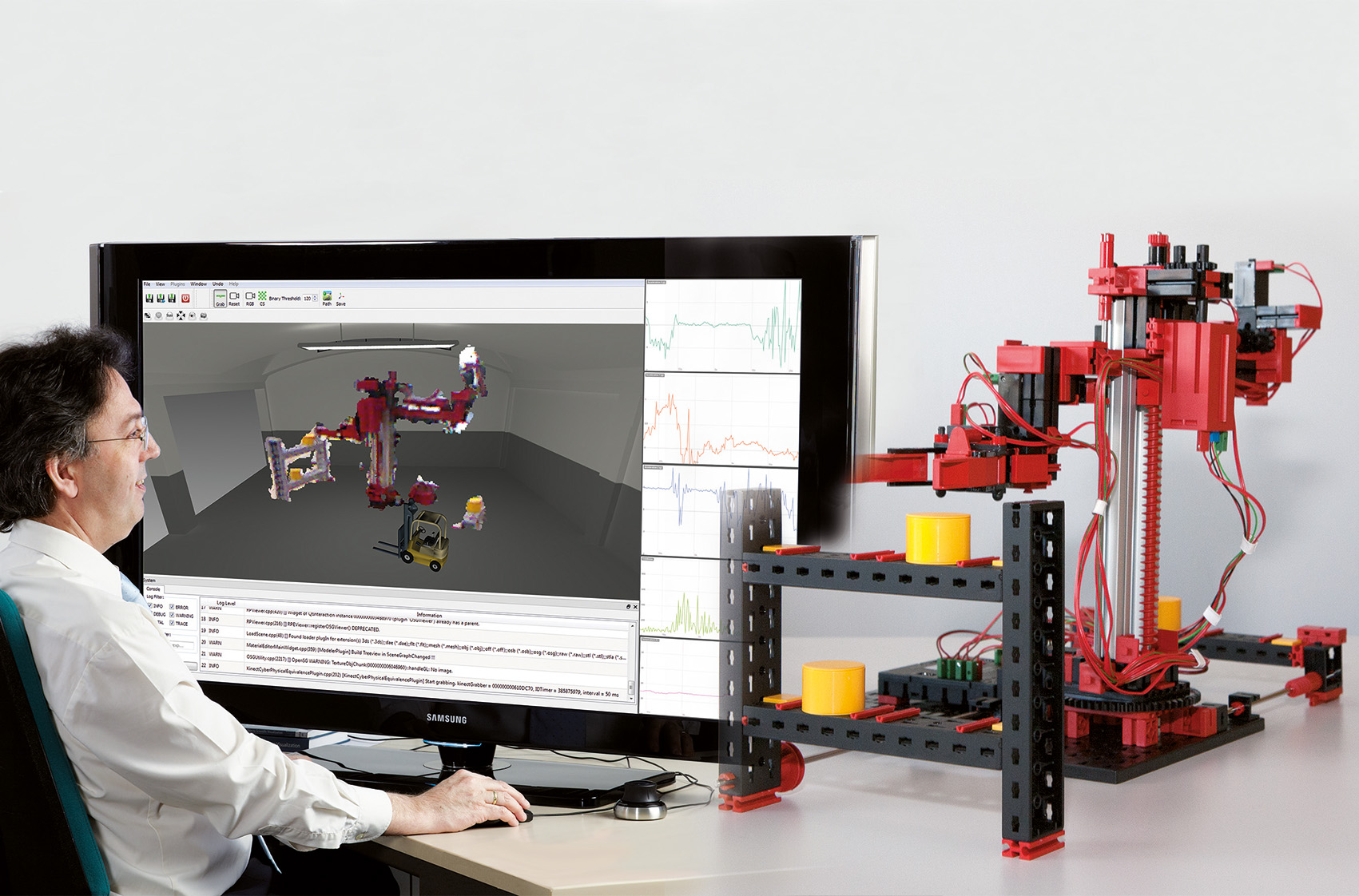 [M] In einer Miniaturfabrik sortiert ein Industrieroboter Spezialbehälter um. Die Szene wird von Kameras erfasst, die den Status der realen Welt kontinuierlich ins Virtuelle übertragen. Die Forscher des Fraunhofer IGD entwickeln Lösungen, um die realen Abläufe in einer Fabrik wieder in den Computer zurückzuführen. Dafür realisieren sie einen ständigen Abgleich zwischen realer und digitaler Welt und ermöglichen eine Evolution der Industrie 4.0, deren Stand sie auf der diesjährigen Hannover Messe (Halle 7, Stand B10) präsentieren.