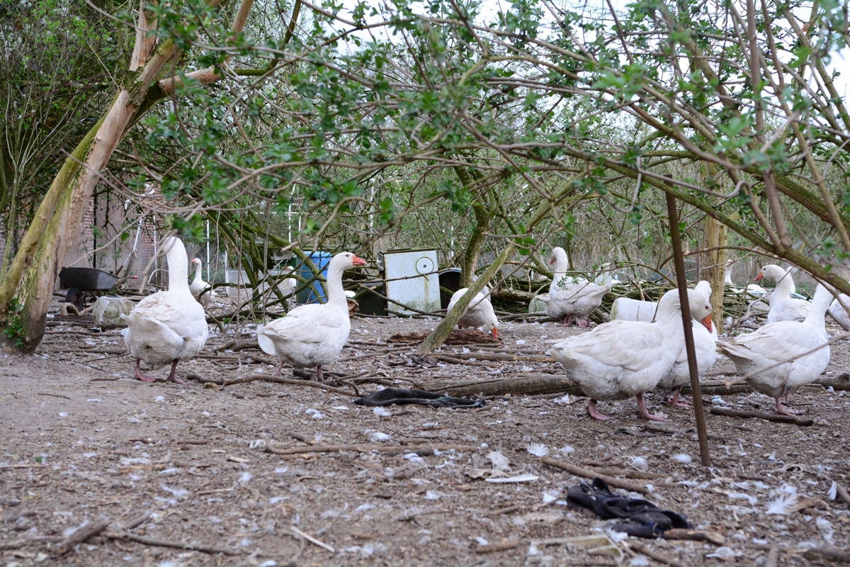 Dabei sind Gänse Wasservögel und Pflanzenfresser, die ihrem Instinkt folgend ihre Nahrung vorzugsweise auf offener Fläche aufnehmen, wo sie nach kurzwachsenden Gräsern oder zarten Pflanzen suchen. Auf diesem Hof aber kann dieser Instinkt tödlich sein. Er kann dazu führen, dass die Tiere herumliegenden Unrat aufnehmen, verschlucken und elendig daran sterben.