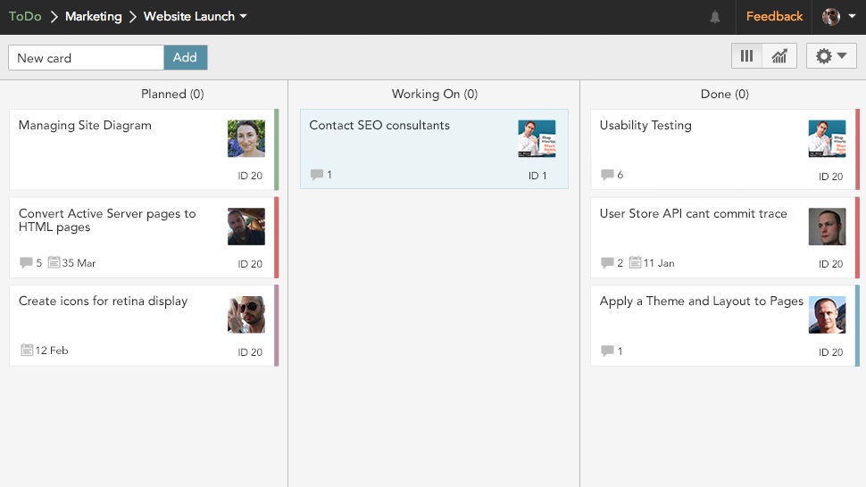 ToDo bekommt vor allem durch die Kanban Boards eine besondere Note: sie erzeugen eine besonders visuelle Erfahrung hinsichtlich Planung, Ausführung und Follow-Up-Aktivitäten eines Projekts. Jedes Kanban Board repräsentiert ein eigenes Projekt oder einen Workflow, zu dem einzelne Karten mit individuellen Aufgaben gehören. Diese Karten können per Drag & Drop zwischen den einzelnen Status-Spalten eines Projekts verschoben werden. So erkennt jeder sofort, wer für was verantwortlich ist, wer sich engagiert oder Inhalte mit anderen teilt. Außerdem erlaubt das Verfassen von Kurzmitteilungen oder die Nutzung von Social Features, Teamkollegen auf besondere Aspekte aufmerksam zu machen, ohne dass sie sich erst durch Massen von E-Mails kämpfen müssen.