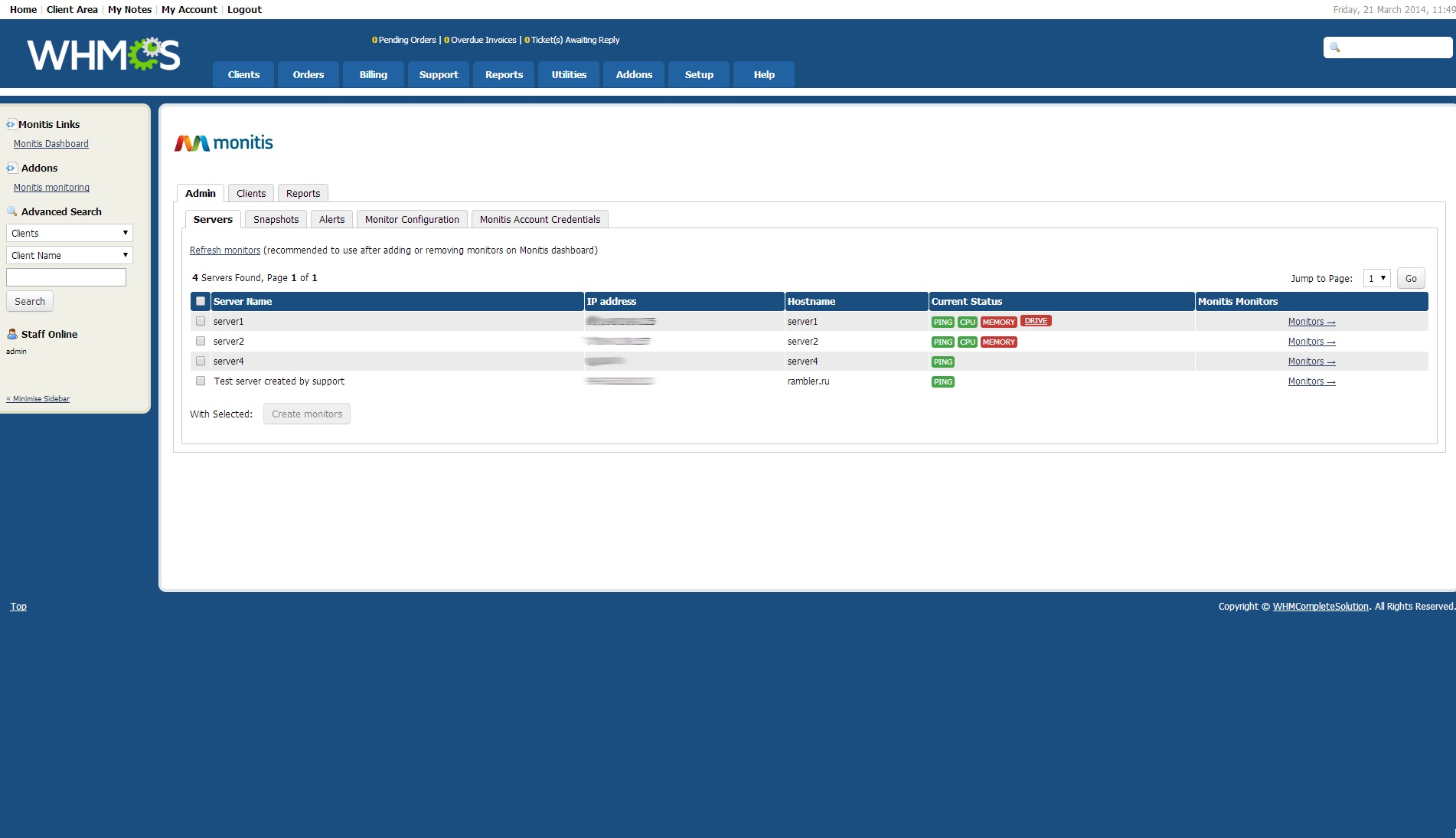 Das neue Monitis Add-On lässt sich nahtlos in die WHMCS-Softwaresuite integrieren und ermöglicht so die Automatisierung und das Management des Monitorings. WHMCS-Anwender können die Konfiguration und Einrichtung der Monitoring-Services für die Online-Dienste, die sie ihren Kunden anbieten, sehr schnell automatisieren und gleichzeitig mühelos die Abrechnungsprozesse bewältigen. Dies sorgt für eine höhere Servicequalität und ermöglicht zusätzliche Umsätze.