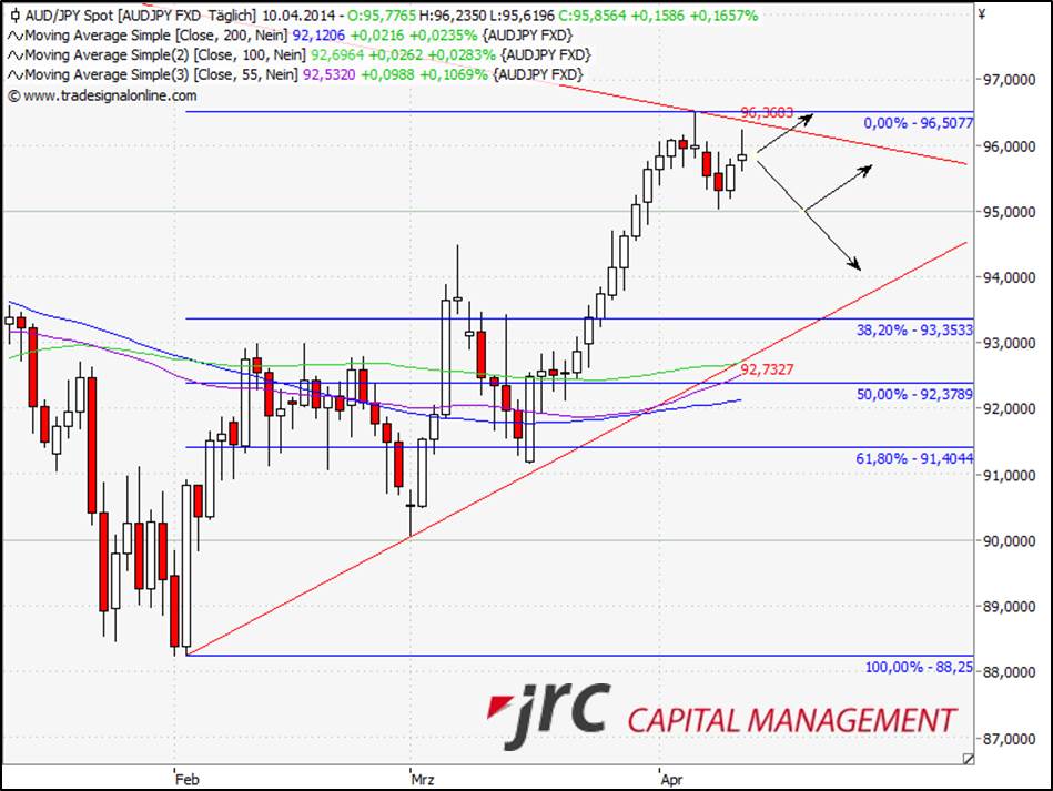 Auf das neue Jahreshoch vom 04.04.2014 folgte eine kurzfristige Korrektur um etwa 150 Pips. Von dort aus könnte der Kurs wieder Anlauf nehmen in Richtung eines neuen Jahreshochs. Dazu müssten zunächst die Widerstände bei 96,36 und 96,50 durchbrochen werden.