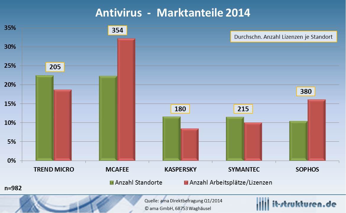 Zum Stichtag 1.4.2014 erfasste ama in den letzten 3 Monaten, welche Systeme derzeit in deutschen Anwenderunternehmen und Behörden, mit mindestens 50 Beschäftigen, installiert sind, von welchen Herstellern diese stammen und wie viele Lizenzen verwendet werden. Insgesamt wurden dabei 982 Unternehmensstandorte identifiziert. Über alle Standorte hinweg wurden 241.300 Arbeitsplätze mit Antivirus-Lösungen ermittelt.