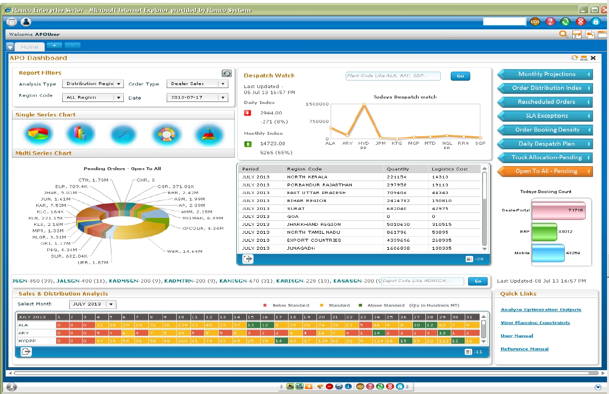ihre Materialbedarfe zuverlässig ermitteln, jederzeit ihre Warenflüsse bedarfsgerecht steuern, Bestände reduzieren sowie Logistik-, Produktions- und Materialumschlagskosten nachhaltig reduzieren können - und das über die komplette Distributionskette hinweg", erklärt Dr. Franz Josef Weiper, Produkt und Business Manager von Ramco Systems Europe. Unter Berücksichtigung verschiedenster Bedingungen lassen sich damit auf einfache Weise optimierte Forecasts und Lieferpläne generieren, die jederzeit entsprechend individueller Anforderungen dynamisch angepasst werden können. Das APO Planungs-Tool ist dabei vollständig in die ERP-Lösung integriert, so dass innerhalb des Systems u.a. eine automatische Zuweisung von Händler- oder Kundenbestellungen oder auch von Fahrzeugen für die Anlieferung ermöglicht wird. Über das Monitoring-Dashboard verfolgt der zuständige Mitarbeiter online und in Echtzeit schließlich die gesamte Prozesskette von der Bestellung über die Sequenzierung der Ladungen bis hin zur Entladung der Fahrzeuge.