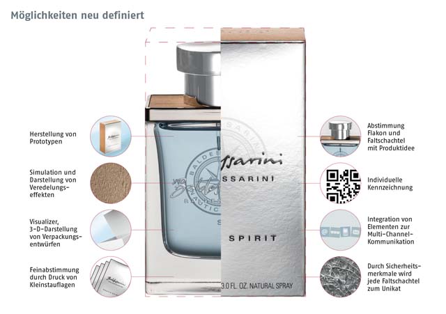 Einen wichtigen Beitrag im Entstehungsprozess der markenstimmigen Verpackung für das Eau de Toilette von BALDESSARINI leistete das Konzept-Paket "Digital". Es beruht auf einer Reihe von Service-Bausteinen, die alle Potenziale digitaler Technologien beinhalten. So zum Beispiel die 3D-Darstellung von Verpackungsentwürfen über einen Visualizer. In einem nächsten Schritt erfolgte die Simulation und Darstellung von Veredelungseffekten, Prototypen und der Druck von Kleinstauflagen in digitaler Drucktechnik erleichterten letztendlich die finale Feinabstimmung.