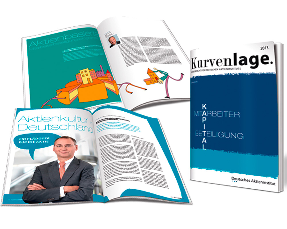 Entstanden ist ein Jahresbericht mit Magazincharakter. Jeweils ein Schwerpunktthema greift aktuelle, öffentliche Diskussionen auf; interne wie auch externe Autoren kommen zu Wort. Berichte über Projekte, Veranstaltungen und Veröffentlichungen liefern umfassende Informationen über die Aktivitäten und Erfolge des Deutschen Aktieninstituts. Die für diese Branche ungewöhnliche illustrative Umsetzung von Aussagen und Themen, wesentliches Stilelement des Corporate Designs und bereits unter anderem in der Imagebroschüre sowie im Webauftritt umgesetzt, prägt auch hier das Layout und schafft so ein unverwechselbares Erscheinungsbild. Große Aufmacherbilder, kombiniert mit zahlreichen weiteren Illustrationen, verleihen dem Bericht einen eigenständigen Charakter und bieten einen flexiblen Rahmen, um auch unterschiedliches Fotomaterial zu integrieren. Abgerundet wird der Bericht durch mehrere über den Inhalt verteilte Doppelseiten, die sich dem Thema Historische Aktien widmen. In der ersten Ausgabe geht es um historische Zooaktien, die damit verbundene Finanzierung von Tierparks sowie interessante und manchmal auch skurrile Geschichten rund um die Entstehung und Erweiterung ausgewählter Zoos in Deutschland. Die zahlreichen positiven Reaktionen auf den Jahresbericht zeigen, dass die Zielgruppe für ein neues, überraschendes Konzept zu begeistern ist.