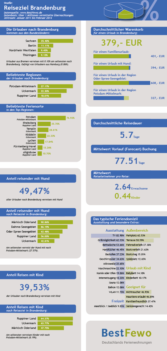 (IINews) - BestFewo untersucht in seiner aktuellen Studie "Berlin-Brandenburg" Brandenburg als Urlaubsziel sowie das Reiseverhalten der Berlin-Brandenburger. Die Studie basiert auf über 1 Millionen vermittelten Übernachtungen in einer Ferienwohnung oder einem Ferienhaus.