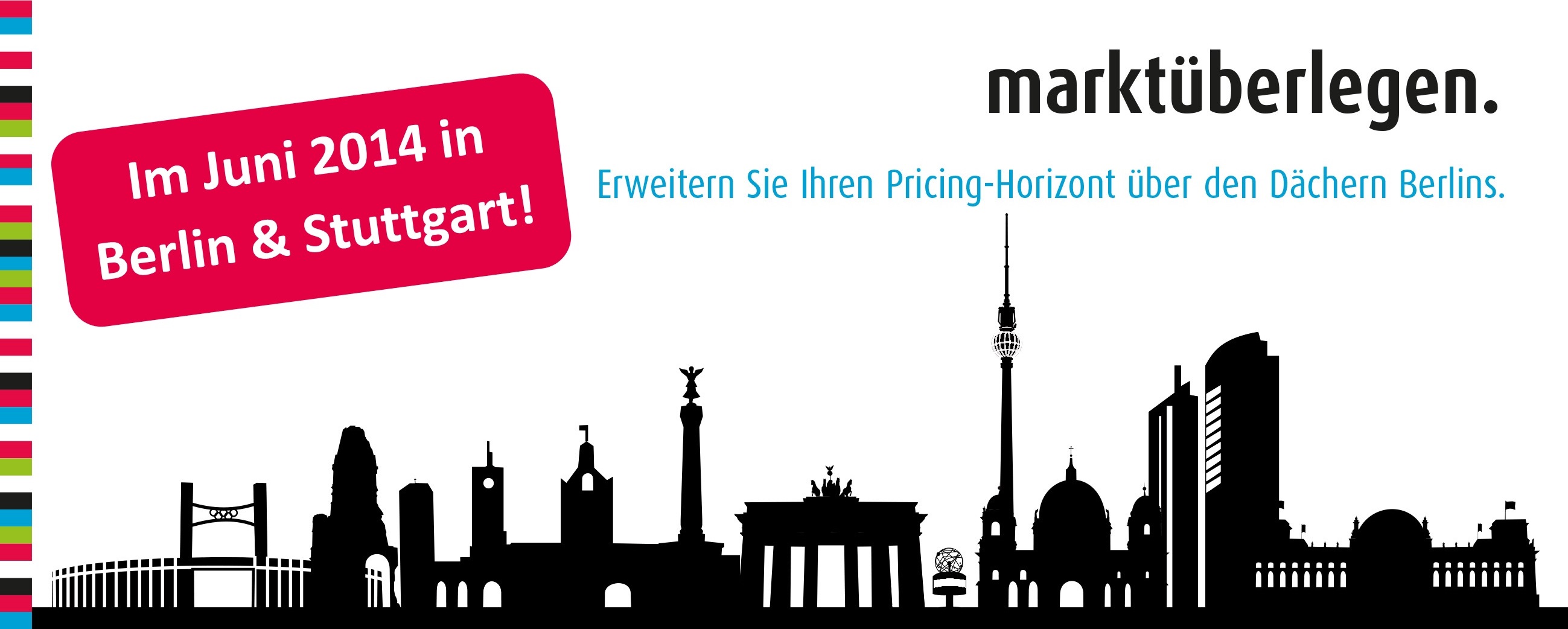 Am Mittwoch, den 4. Juni 2014 findet "marktüberlegen." im Ullrich-von-Hassell-Haus in Berlin statt. Interessierte Online-Händler erfahren in entspanntem Umfeld, welche Möglichkeiten der strategischen Preispolitik sich für sie eignen. Im anschließenden Workshop können sie alle gewonnenen Erkenntnisse praktisch anwenden. Dabei wird anhand verschiedener Szenarien und mit auf die Teilnehmer zugeschnittenen Produktdaten getestet, wie sich unterschiedliche Preisstrategien auf die Unternehmenskennzahlen auswirken. Zwischen den einzelnen Programmpunkten der Preisstrategie-Schulung bieten sich immer wieder Gelegenheiten zum persönlichen Austausch mit den Pricing-Experten von Conomic und Webdata Solutions.