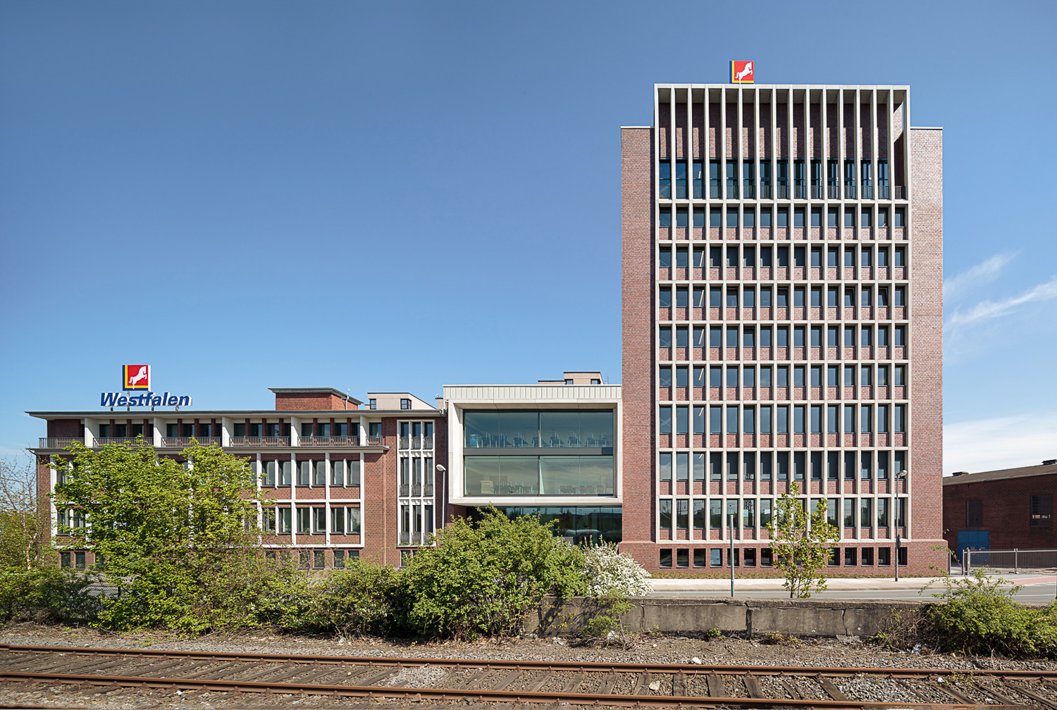 "Wir wollten keinen anonymen Glaspalast", blickte Wolfgang Fritsch-Albert zurück. "Stattdessen soll der Westfalen Tower zeigen, wofür unser Unternehmen steht: für Tradition und Innovation." In Zusammenarbeit mit dem Münsteraner Architekturbüro Bleckmann & Krys sind diese Werte in Baukunst umgesetzt worden: Die Fassade des Westfalen Towers stellt mit rotbraunem Klinker und sandsteinfarbenen Fenstereinfassungen deutliche Bezüge zum benachbarten Altbau von 1958 her. Neun Geschosse des Turms bieten Platz für die dringend benötigten neuen Büros; je Ebene stehen etwa 200 Quadratmeter nutzbare Bürofläche zur Verfügung. "Abteilungen, die bislang an anderen Standorten in Münster untergebracht sind, können demnächst an den Firmensitz zurückkehren", freute sich Wolfgang Fritsch-Albert. Die zehnte Etage ist komplett für Meetings und Großveranstaltungen ausgestaltet, im obersten Stock befindet sich die Haustechnik.