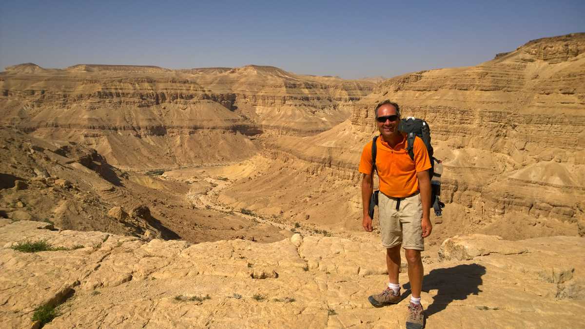 Ab Arad geht es dann 400 Kilometer durch die Judäische Wüste und dann spektakulär durch die Negev-Wüste. Diese darf man sich nicht so wie die Sahara sondern als abwechslungsreiche trockene Gebirgskulisse und Kraterlandschaft vorstellen. Hier wurde Christian Seebauer von Uniprofessor Dr. Haim Berger mit kleinen Wasservorräten in einigen Nightcamps in der Wüstenlandschaft versorgt. In die Wüste darf man niemals ohne ausreichend Wasser aufbrechen oder gar andere danach fragen, sonst bringt man sich selbst und andere in Lebensgefahr, wusste Seebauer schon vor seiner Reise.