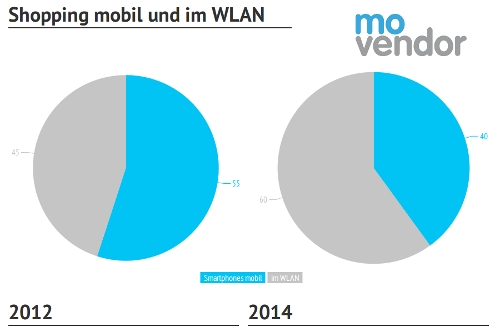 Dem Online Marketing (http://www.movendor.com/online-marketing.html) eröffnen sich interessante Zahlen zur Verteilung der Smartphone Benutzer beim Shoppen. Vergleichen mit einer eigenen Studie von 2012 zeigt sich die Verschiebung des mobilen Shopping hin zum Festnetz mit etwa 60% (2012: 45%), wobei sich im Gegenzug die mobile Conversion Rate auf Smartphones speziell im mobilen Netz auf mehr als 1% steigern konnte (2012: 0,6%).