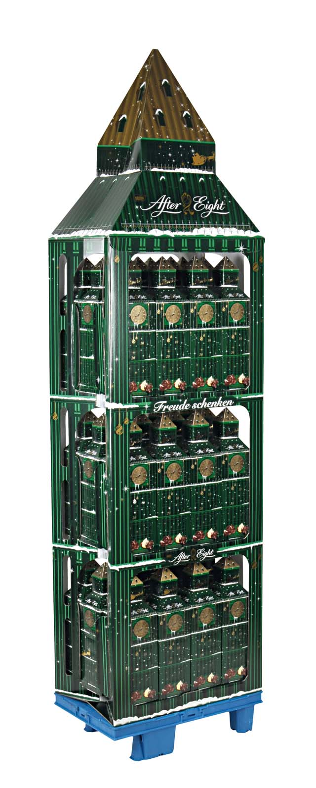 Das Display besticht durch seine einzigartige Form, die an das weltberühmte Londoner Wahrzeichen Big Ben angelehnt ist. Das Design wurde perfekt auf das Produkt zugeschnitten - einen Adventskalender in Form des Big Ben. Er enthält Sortimentsvariationen der beliebten "AFTER EIGHT-Pralinen". Das Display ist - dem Markenauftritt von "AFTER EIGHT" entsprechend - im charakteristischen dunklen Grünton gehalten, gepaart mit goldenen Elementen. Es beeindruckt durch einen 6-farbigen Offsetdruck sowie die Veredelung mit Dispersionslack.
