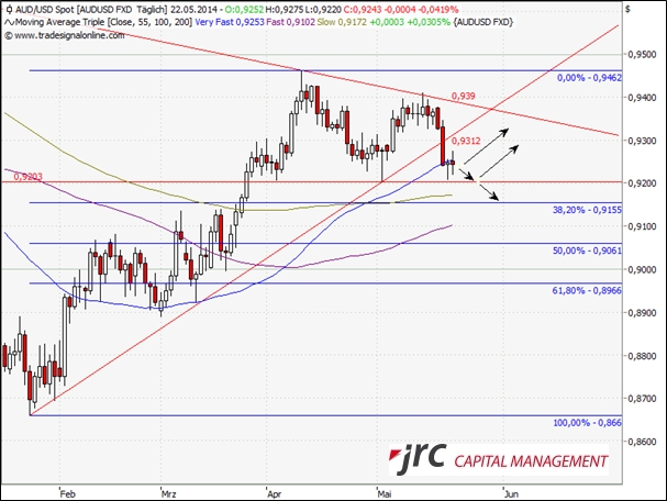 Der Aufwärtstrend des AUD/USD wurde am 20.05.14 durchbrochen, doch überzeugend ist die Bewegung bisher aufgrund des Reversals am Folgetag noch nicht.