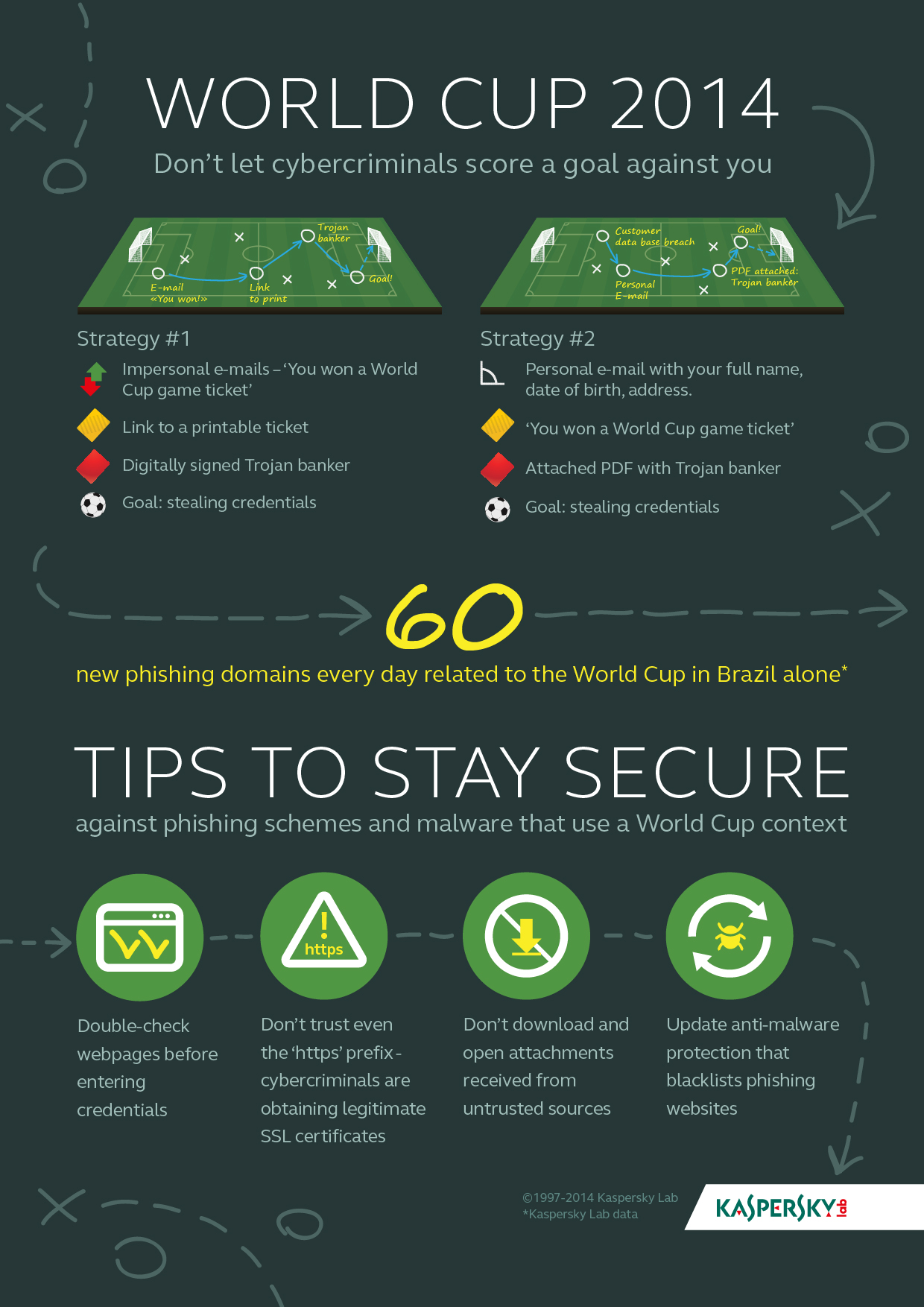 Entsprechend des globalen WM-Interesses haben Cyberkriminelle bereits seit Anfang des Jahres (http://www.kaspersky.com/de/about_kaspersky/news/allgemeine/2014/Fussball_-_Fans_aufgepasst_Cyberkriminelle_mit_bosen_Fouls_zur_Fussball_-_WM_in_Brasilien_) verstärkt Fußball-Fans auf der ganzen Welt im Visier. Neben Phishing haben die Cyberkriminellen hier auf die Verbreitung von Schadprogrammen in Spam-Mails gesetzt - anstatt eines angeblichen WM-Tickets holten sich die Nutzer beispielsweise einen Wurm (Worm.VBS.Dinihou) auf ihren Computer.