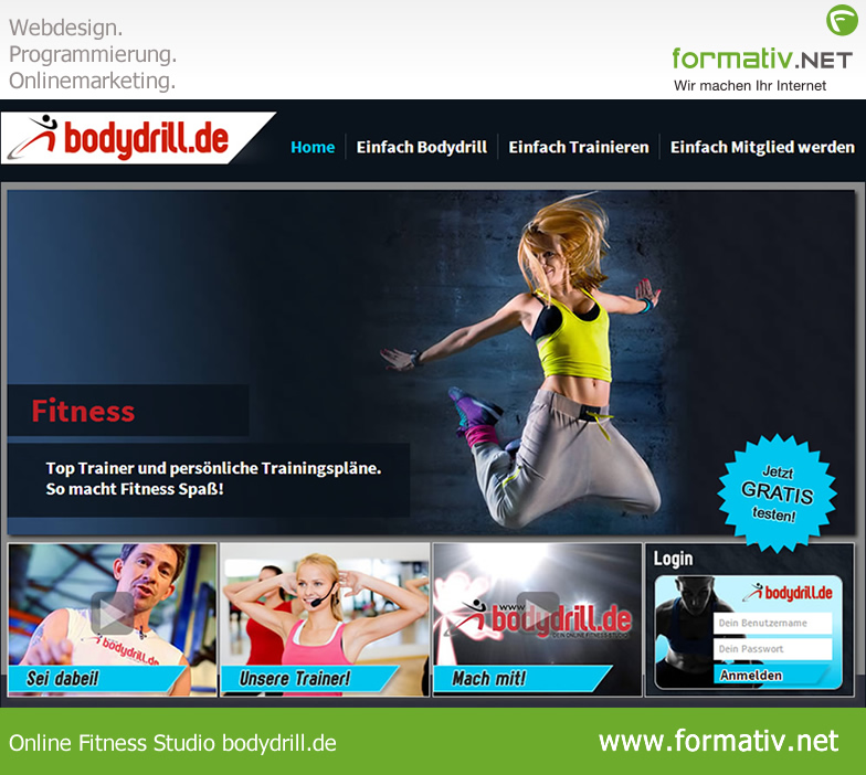 formativ.net Internetagentur Frankfurt und Karlsruhe erstellt im Auftrag der bodydrill GmbH umfangreiches Video-Portal mit Online Fitnesskursen und mehr. Neuer Trend - Abnehmen und Trainieren im Internet, jederzeit undüberall.
