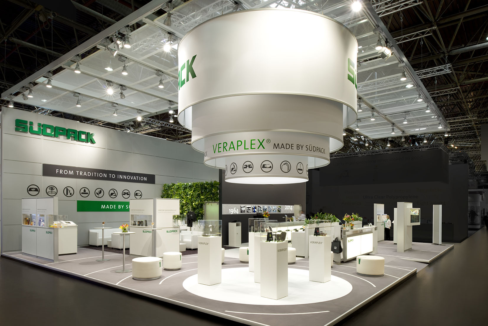 Den Fokus des Messestands bildete eine Highlight-Area. In diesem Bereich wurde das innovative Produkt Veraplex - eine neue Foliendimension - in Szene gesetzt. Durch ein Smart Window erhielt die Produktpräsentation einen interaktiven Touch: Reale Produkte wurden ansprechend präsentiert, zusätzlich konnten die Besucher virtuell Informationen abrufen. Analog zum Firmengebäude von Südpack war die Rückwand des Messestandes im Metallic-Look gehalten, wodurch eine hochwertige Optik erzeugt wurde. Ein Zeitstrahl und Grafiken zeichneten den Verlauf der Firmengeschichte nach - und banden die lange Unternehmenstradition in die Markeninszenierung ein. Die Themen Nachhaltigkeit und Umwelt wurden über eine Pflanzenwand optisch und inhaltlich aufgegriffen.