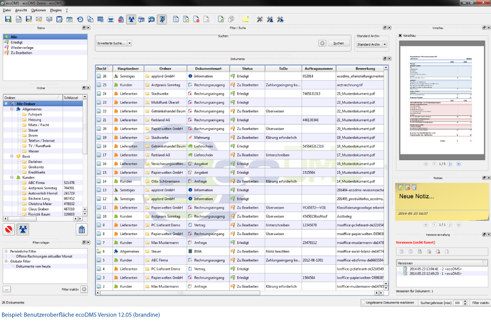 Das Dokumentenmanagementsystem ecoDMS stammt aus dem Hause applord in Aachen. Die Planung und Umsetzung einer Software für die digitale Posteingangsbearbeitung eines Großkunden war der Startschuss zur Entwicklung des eigenen Archivsystems. Auf Basis dessen und der langjährigen Erfahrung in den Bereichen Dokumentenarchivierung und Workflow wurde der ecoSIMS Process Server entwickelt. Dieser bildet die Grundlage von ecoDMS und sorgt durch seine serviceorientierte Architektur (SOA) dafür, dass sich bestehende IT-Infrastrukturen an den geschäftlichen Anforderungen eines Unternehmens modular und flexibel ausrichten lassen. Für sensationelle 49 Euro pro gleichzeitiger Verbindung zum Archiv erhalten die Kunden mit ecoDMS ein professionelles Dokumenten-Management-System, das mobil, im Web, im Netzwerk und lokal verwendet werden kann. Von einer komfortablen Posteingangsbearbeitung, einer automatischen Dokumentenablage, der sicheren Archivierung beliebiger Dateiformate und Schnittstellen zu gängigen Office und E-Mail-Programmen, bis hin zum blitzschnellen Wiederfinden aller Dokumente und der einfachen Integration in die bestehende Systemumgebung, bietet dieses Client-Server-System jeglichen Komfort für die Anwender.
