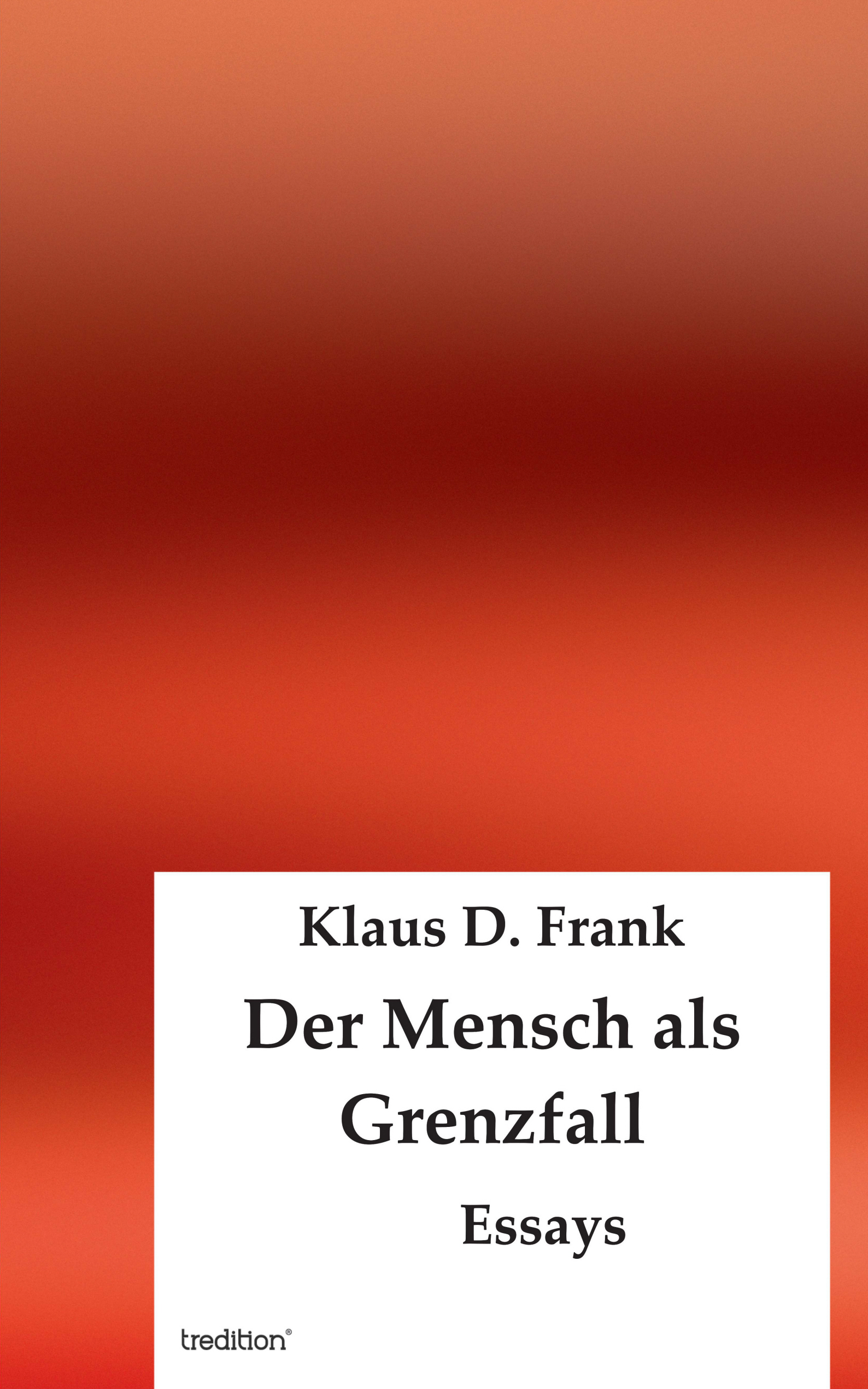 "Der Mensch als Grenzfall" von Klaus D. Frank ist ab sofort im tredition Verlag oder alternativ unter der ISBN 978-3-8495-7905-0 zu bestellen. Der tredition Verlag hat es sich zum wichtigsten Ziel gesetzt, jungen und unbekannten Autoren die Veröffentlichung eigener Bücher zu ermöglichen, aber auch Verlagen und Verlegern eine Kooperation anzubieten. tredition veröffentlicht Bücher in allen Medientypen, vertreibt im gesamten Buchhandel und vermarktet Bücher seit Oktober 2012 auch aktiv.